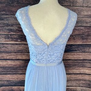 I loved this dress but never ended up wearing it. Still in the same beautiful condition that it was received in. A beautiful blue periwinkle color. Zip closure. Pretty lace on top.