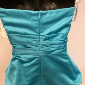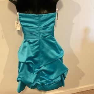 Beautiful color. Ruching at bust, waist, and all down the skirt. Hem is stitched under for extra poufiness. Back zipper. Strapless. Lightly padded bra. Pit to pit measures approximately 15 inches. Flat lay waist measurement is approximately 13 inches. Hips 18 inches. Length is 27 inches. New with tags.