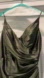 Good, worn once and dry cleaned after use. Functional side zipper. Length hemmed for someone 5’4” and straps are adjustable. One quarter-sized discoloration on the bottom right near ankle (pictured), missing one fabric button cover on the side (pictured)