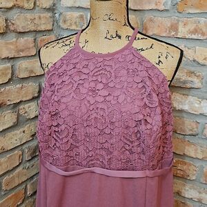 David's Bridal Mauve Halter style maxi gown dress, lace bodice, A-line skirt, invisible back zipper, lined to approximately knee lenth, size 24. Excellent pre loved condition, measurements in pics, smoke-free home, ships next day. Bundle and Save!