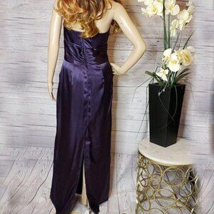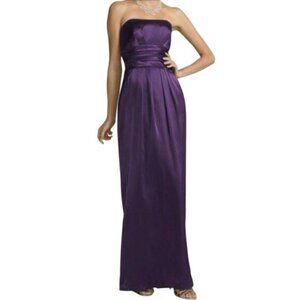 This elegant strapless gown from David's Bridal is crafted with luxurious charmeuse fabric, ensuring a glamorous and flowing silhouette for any formal event. Its deep purple hue adds a touch of sophistication, while the polished design with pleated detailing accentuates the natural waist. Ideal for evening occasions, the gown exudes timeless elegance.