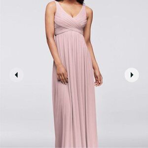 David's Bridal NWT Style F15933 Guava Long Mesh Dress Cowl Back Detail Size 4. Pit to pit 17", shoulder to hem 59", Crisscross Ruched V Neck Front, Flowy Cowl Draped Back, Hidden Zip Closure, Sleeveless, Chiffon Look, Fully Lined, Retail $159