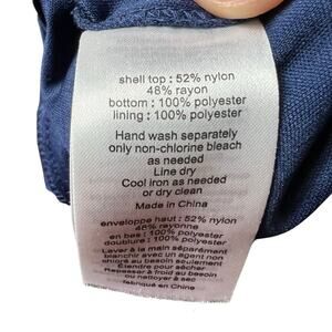 Meticulously crafted with premium materials: lace shell top (52% nylon, 48% rayon), flowing skirt (100% polyester), and full lining (100% polyester). The dress shows excellent condition with no visible flaws, stains or damage. The asymmetrical neckline and intricate lace pattern elevate this versatile piece for any semi-formal to formal occasion.