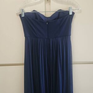 David's Bridal marine blue Strapless gown with Pleated details on the Empire Bodice and Skirt. Fully lined with Pleated panels all around.