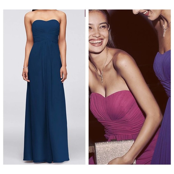 NAVY David's Bridal Long Strapless Chiffon Dress with Pleated Bodice