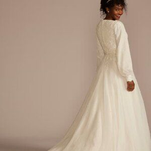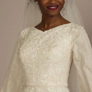 David's Bridal Oleg Cassini Long Sleeve Pearl Tulle Modest Wedding Dress Size 26