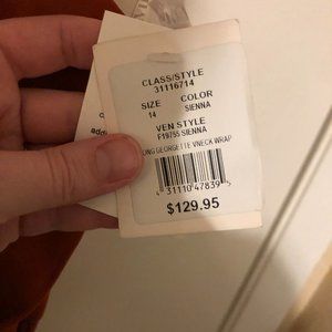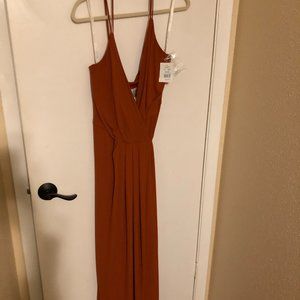 Elegant orange maxi dress by David's Bridal. Features a wrap-style bodice and flowing skirt. Perfect for formal occasions.
