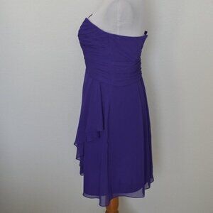 David's Bridal short crinkle chiffon dress with front cascade detail in size 2. Purple, Regency color. Strapless. Pleated, ruched bodice with boning. Back zipper. Fully lined. Zipper does zip all the way up, mannequin is slightly too large for the dress.