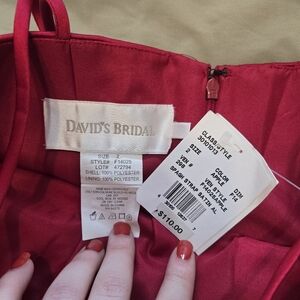 Small area of dirt on back hem, assumed to easily wash off. Elevate your event wardrobe with the sophistication of a satin midi dress from David's Bridal, designed to capture both elegance and practicality. This size 2 A-line dress features a flattering square neckline and a sleeveless cut, ideal for the warmer spring and summer months. The rich red color makes a bold statement, while the spaghetti straps provide a delicate touch.