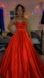 Elegant red strapless prom dress. Features a fitted bodice with pearl accents. Flowy skirt for a dramatic look.