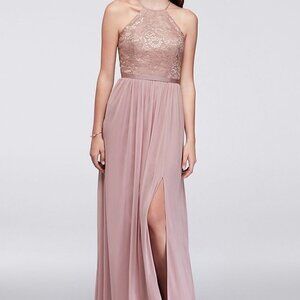 David's Bridal Rose Gold Metallic Open-Back Lace Long Bridesmaid Dress Size 8
