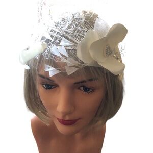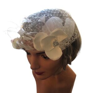 Gorgeous New Russian tulle blusher veil is affixed to a Silver headband, with Silk Flower and Swarovski Crystals for a fun, retro vibe. Ivory. New in box. Headband fits most.