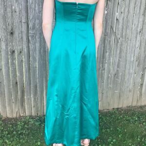 David's Bridal Satin A Line Draped Gown Beaded Neckline Strapless Turquoise. Features faux wrap/criss crossed bodice with pleating. Boning in bodice, hidden back zip, fully lined. Style number F14853.