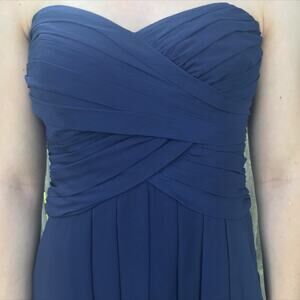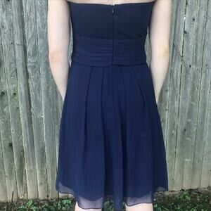 David's Bridal Short Crinkle Chiffon Dress Front Cascade Navy Strapless Mini. Sweetheart neckline. Criss cross pleated bodice. Pleated skirt with diagonally layered, waterfall ruffle hem. Short, just about knee length. Fully lined. Hidden back zip and hook closure. 100% polyester. Style number F14847.