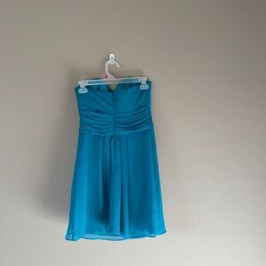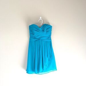 This is a David’s Bridal bridesmaid dress in great condition! Short crinkle chiffon style with front cascade. In the color “Oasis”. Only worn once to a wedding. Size 2. Bust has been altered to fit a 34A chest.