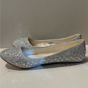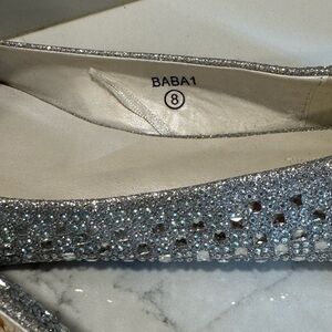 Shine with every step in these elegant silver glitter flats from David's Bridal. Perfect for adding a touch of sparkle to any outfit. Perfect for prom and weddings! No missing gemstones! In wonderful condition. There are signs of wear on the bottoms and some of the glue on the inside is showing.