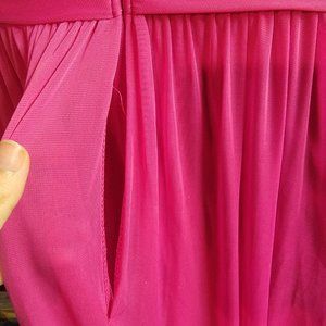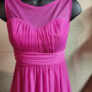 David's Bridal mesh shoulder dress. Color is Begonia. This was worn once. There are a few snags and the mesh part on the back needs sewn - See photos. Overall a very nice dress.