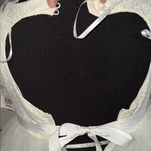 Flower girls will feel like they're living in a real-life fairy tale in this ball gown with a full tulle skirt and lovely lace bodice. The sweetest part: a heart cutout and bow in the back. Mini magic! This style is available in infant and toddler sizes.