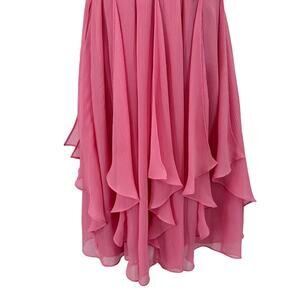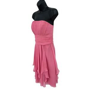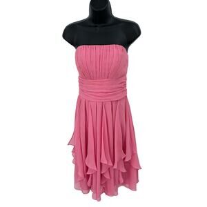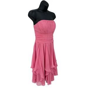 Women's Strapless Chiffon Midi Dress by David's Bridal, US Size 2, Pink in Color, Pleated bodice, Built-in Bra with back Hook closure, Fully Lined, Open Back with Zip Closure, Layered Skirt, Pullover style, Casual, Party, Club, Date Dress, Formal Function, Wedding Guest, Perfect for many occasions. Create a soft and romantic silhouette.