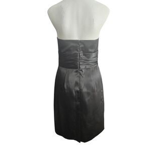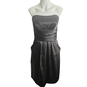 This short charmeuse dress is fun and stylish. The strapless neckline is sleek and fun. It has a ruched waist and pockets! Wear this dress to a wedding and again for another special occasion. The basic silhouette will keep this dress in your closet for years.