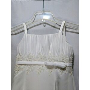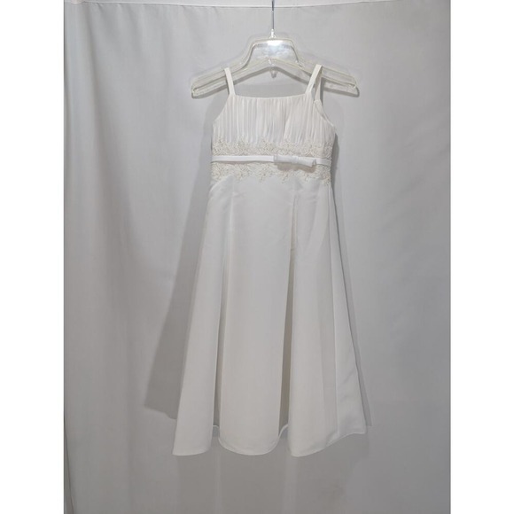 New with tags David's Bridal satin A-line dress in white, style V1248. Features a pleated bodice with intricate lace and bead detail, small bow at waist, and adjustable shoulder straps. Fully lined with nylon netting for shape. Includes original spare bead kit and tags attached. Perfect for flower girl, first communion, or formal occasion.