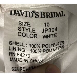 This elegant white wedding dress by David's Bridal features a strapless design with intricate beaded embroidery. Made from durable polyester, it promises comfort and easy movement. The stylish train adds a dramatic flair, making it a distinguished choice for your special day.
