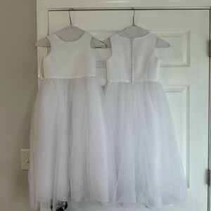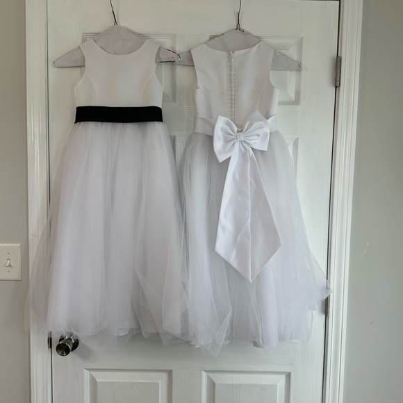 Size 5 and Size 6! Elegant white dresses with either black sash bows or white! Perfect for formal occasions. Features a bow and tulle skirt. Sizes 5 and size 6 available! Dresses come with both a white and black bow! In store you would have to purchase those separately!