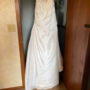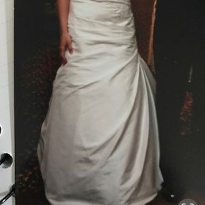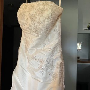 White maxi sequined strapless wedding dress with a mid sized train . Has pearls, silver stitching sequins and cubic zirconium. Can be bustled .Includes a 36 b back hooked corset and a full taffeta ruffled long slip.