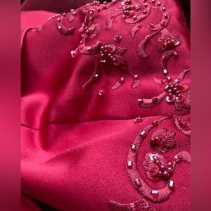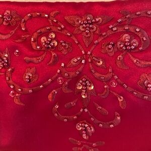 Gorgeous David's Bridal Red Strapless Gown! This gown has a lovely beaded pattern on the bust, adjustable hooks to customize fit and some material toward