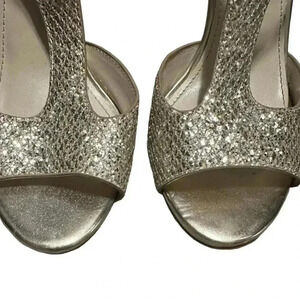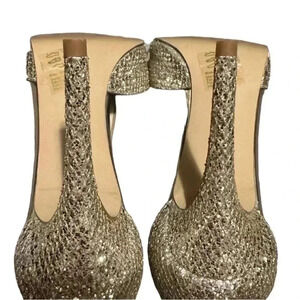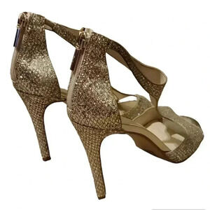 Davids Bridal Womens Sz 8 1/2 Gold Glitter Stiletto Heel Ankle Strap Zipper Heel