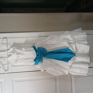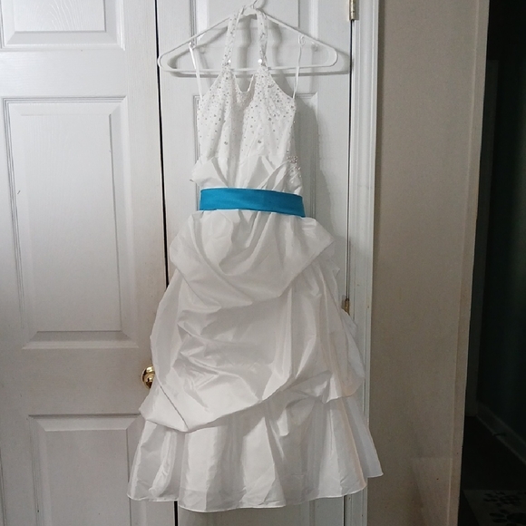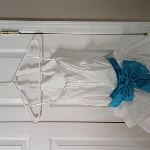 David's Bridal girls White Halter Dress with Turquoise Blue sash bow