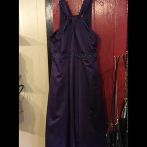 Lovely cross bodice with beading at waist gown. Size is 20. Dress was worn once. Deep purple color. Tag says Wash by hand /Line dry and was washed and looks great!