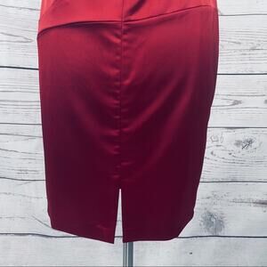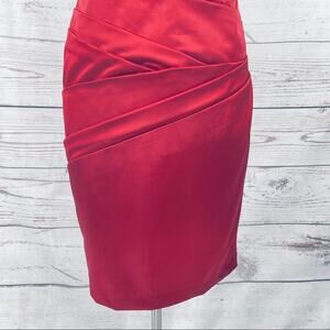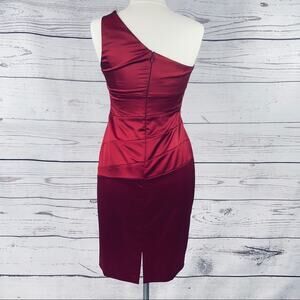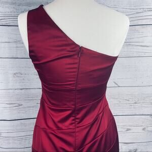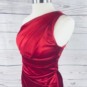 David's Bridal style 85106. Single shoulder red dress with ruching. Stays at sides, color is called Apple. Rear zipper with hook and eye, fully lined, rear kick pleat. Size 8