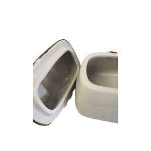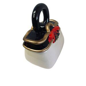 This festive Davids Cookies Christmas Themed Purse Cookie Jar in white, red, and black, adorned with a bow and holly, adds holiday cheer to any kitchen. The 5-inch size stores cookies perfectly.