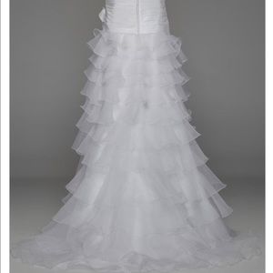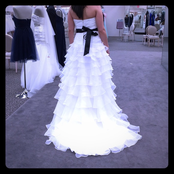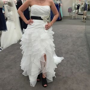 High low wedding dress size 8. Bought this on the sample rack at David's bridal and decided not to wear it. Tags attached and no alterations. dress does NOT come with the belt or flower attached to belt... I was just trying different accessories! There is a flower under my hand in 4th pic that you can see in stock photos. This dress is VERY COMFY and would be perfect as a reception dress. Reasonable offers accepted!