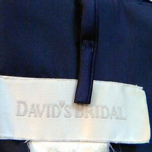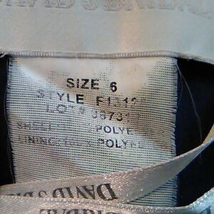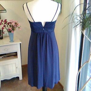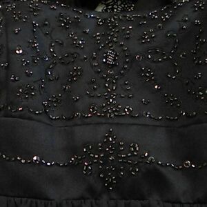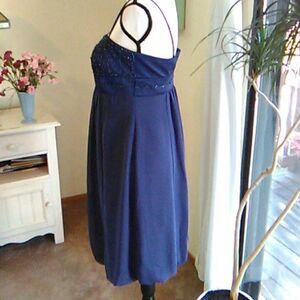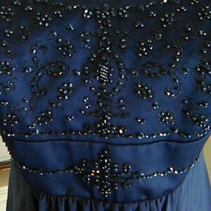 Dramatic deep navy blue satin bodice embellished with beads. Supports in bodice for a perfect fit. Satin straps that are removable. Back zip with interior hook . Sheer overlay, fully lined. Bubble hem. Size 6 measures 34 at chest, 30 under chest, 40 at hips, 39 long from shoulder to hem. Perfect for a special evening, simple and elegant.