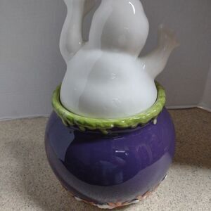 Super cute cookie Jar perfect for Halloween One chip on inner rim that barely shows on outside. No cracks. See pictures as they are part of the description.