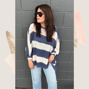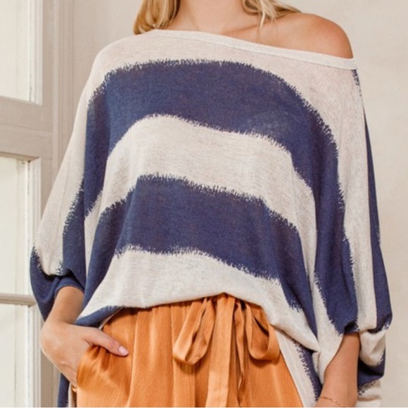Elevate your style with this elegant off-shoulder sweater in blue and cream. Perfect for a chic, casual look.