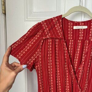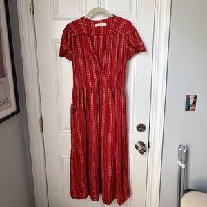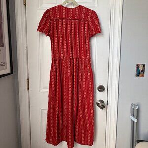 The OG Dawn dress by Christy Dawn-- slow made in LA from 100% organic cotton. This color/print is no longer available online, its a warm terracotta-y red. Breathable but not see through. Only worn twice, very good condition- no flaws.
