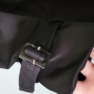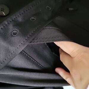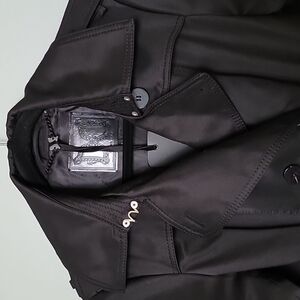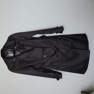 Heavy black jacket. Fully lined. Belted closure. Has a double breasted look. Pockets in front. A great classic piece to add to your wardrobe. Pleats in the back, still sewn closed. Staple piece, Matrix, Capsule wardrobe, Classy, classic, sleek, timeless, elegant, feminine, goth, elevated, fall, autumn, winter