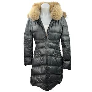 Dawn Levy Womens Black Zip Up Hooded Fur Collar Goose Down Puffer Coat Jacket M