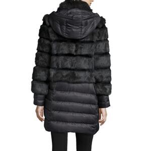 Dawn Levy "Tallula" combo quilted puffer coat with dyed rabbit fur trim.