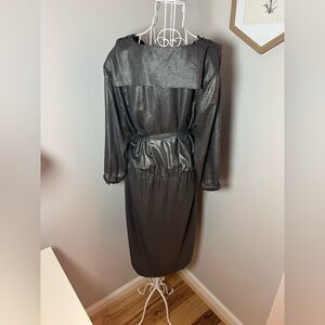 Keywords: cocktail, holiday, shimmer, wrap, chiffon, tie waist, v neck, shoulder pads, designer, new years, festive