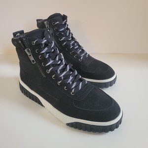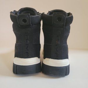 These Daemon boot sneakers have a black synthetic, suede-like boot upper, and white sneaker type outsole. They have lace-up and zip closures. All synthetic materials. The back of the boot is about 5 inches high. These shoes ship with original box, but no lid.