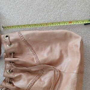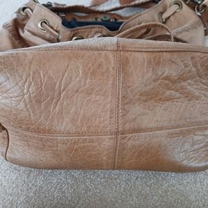 This beautiful Day & Mood shoulder bag is the perfect addition to any outfit. The drawstring closure adds a unique touch to the bag, while the medium size makes it versatile for any occasion. The exterior is made of high-quality leather in a gorgeous tan color, complemented by a black lining. The bag features a single leather handle/strap for easy carrying. The brand Day & Mood is known for their stylish and durable bags, and this one is no exception. It is part of their Day & Mood product line, which is known for its exceptional quality. This bag is ideal for women who are looking for a medium-sized shoulder bag that can match any outfit.