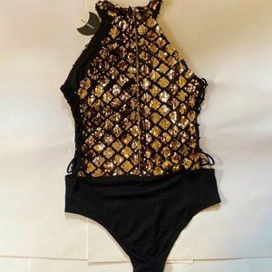 Day & Night Black &Gold Sequin's Halter Bodysuit Size 3x (NWO)