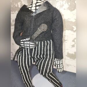 unique skeleton doll wearing black and white striped pants.