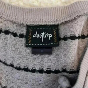 This comfy long sleeve top from Day Trip features a waffle kinit fabric with a split hemline for extra room. In good pre-owned condition, this shirt is a size medium. The color is a mocha/ grey and black.