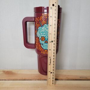 Day of the Dead (Dia De Los Muertos) Maroon Sugar Skull Tumbler 40 oz. w/ Lid & Straw. Stainless steel inside and out. Used only ONCE for water. Excellent, like new condition. Comes from a smoke free home.