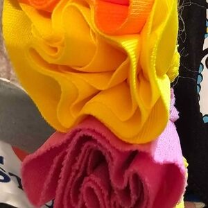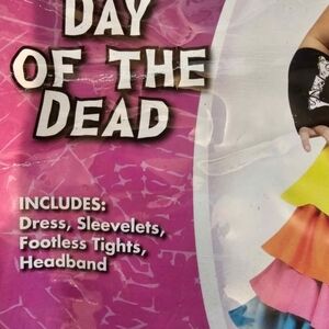 Celebrate in style with this vibrant Day of the Dead kids costume. Featuring a colorful skirt with layers of yellow, pink, and blue, this outfit is perfect for festive occasions. Includes dress, sleevelets, footless tights, and headband.